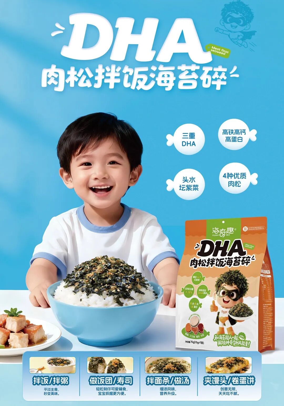 产品以头水坛紫菜为基底,保留天然矿物质与膳食纤维,搭配鳕鱼肉松、三文鱼肉松、猪肉松、牛肉松,肉松总含量≥28%,特别添加 DHA 藻油与益生元,高铁、高钙、高蛋白,为孩子成长提供充足营养。