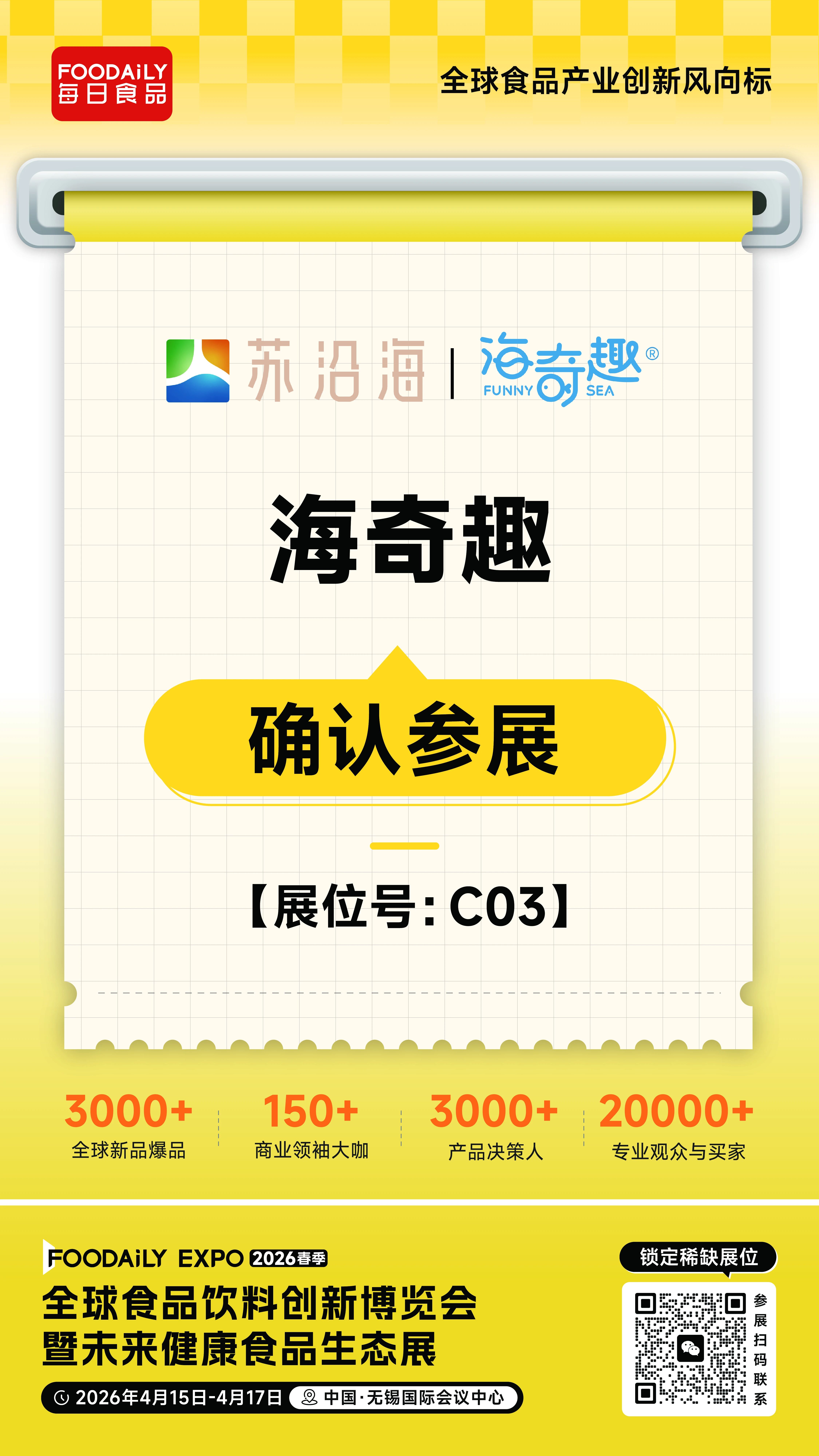 2026 Foodaily创新博览会,海奇趣将携旗下海洋健康食品创新成果亮相于无锡国际会议中心,C03展位,邀各界伙伴共探海洋生物高值化利用新路径,共筑海洋功能食品产业新未来!