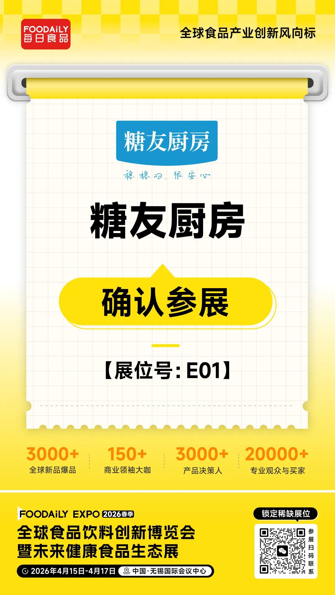 2026 Foodaily创新博览会,糖友厨房将携旗下全系列控糖健康美食亮相无锡国际会议中心,E01展位,与行业伙伴共筑健康食品产业新未来。