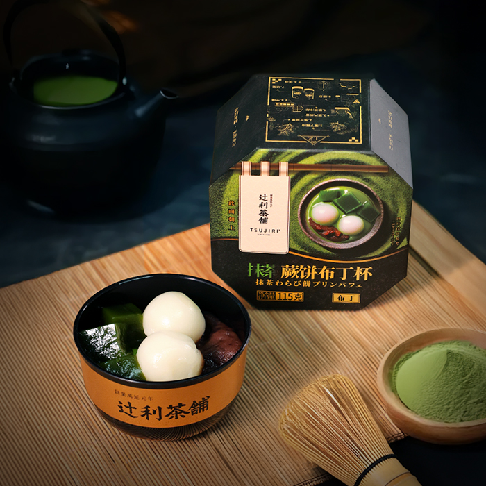产品延续善哉的风味脉络,将传统元素融入创新甜点形态。底部以丝滑的抹茶布丁为基调,口感醇厚清香,上层铺放米香浓郁的白玉丸子、软糯抹茶蕨饼,搭配低甜细腻的红豆,形成“四味一勺”的丰富口感,入口温润、甘苦交织。