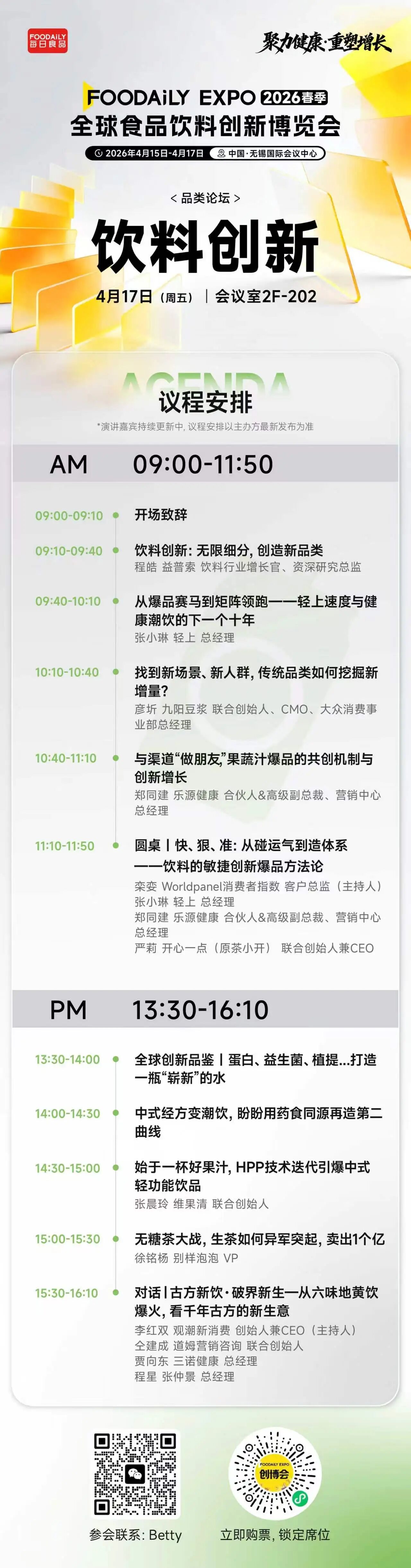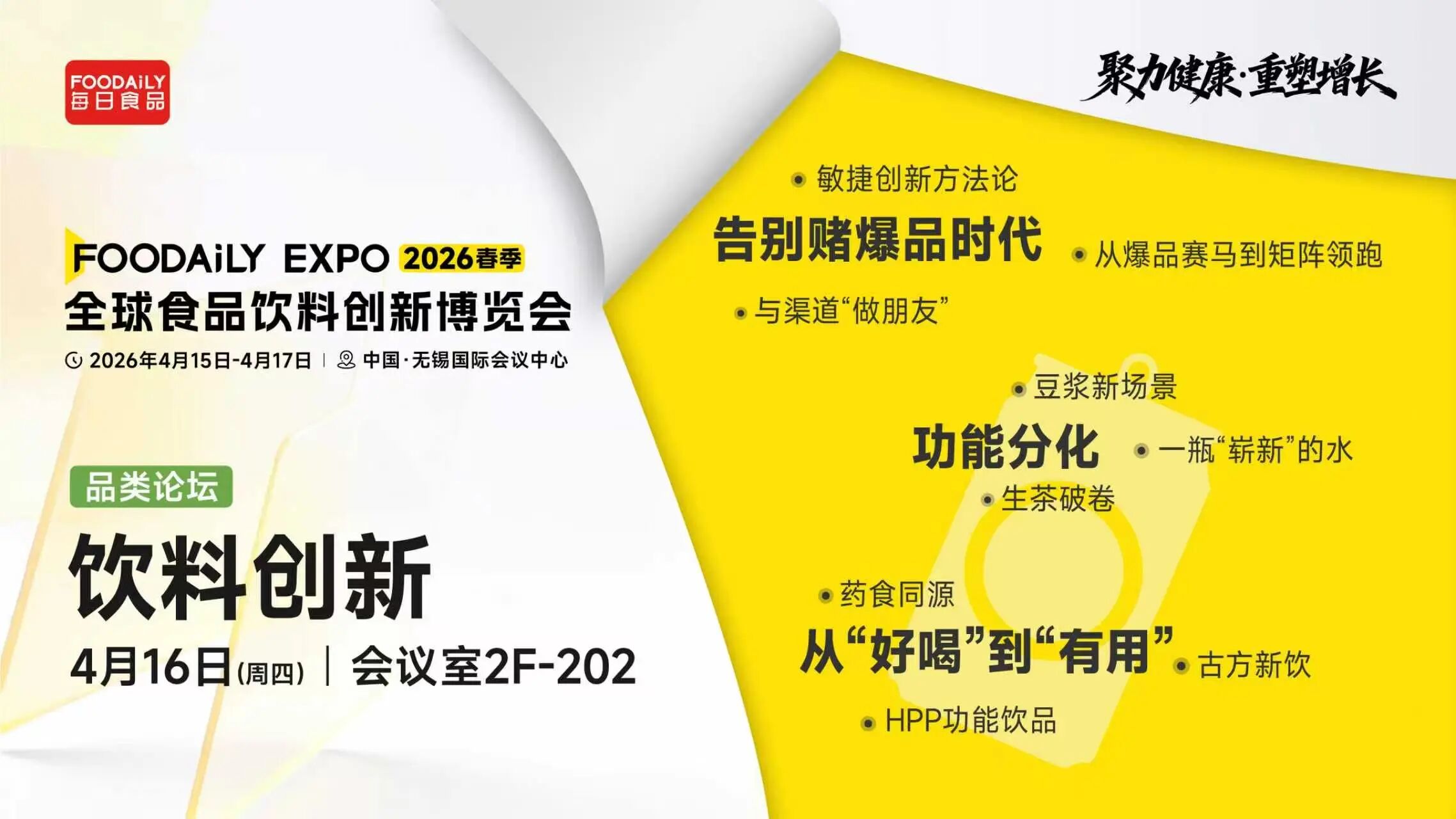 当健康需求不断细分、消费场景持续裂变,饮料行业的每一个参与者都在寻找同一条路——如何在红海中,走出一条属于自己的路。2026 Foodaily创新博览会「饮料创新」品类论坛,我们已备好案例、方法论与同行者。剩下的,等你来一起探讨。