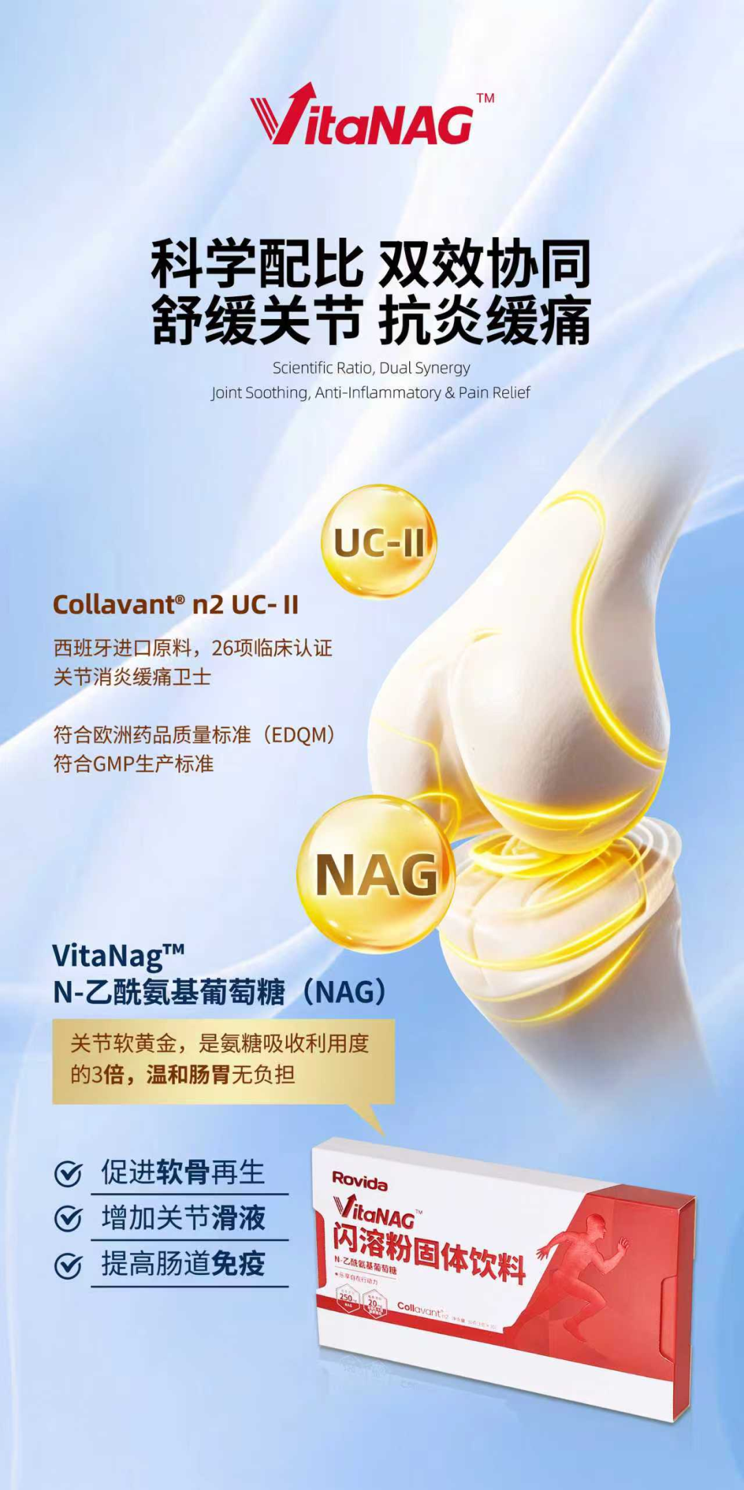 独特结合“信号引导”(非变性Ⅱ型胶原蛋白)与“营养补充”(NAG)双路径,协同作用,科学养护。