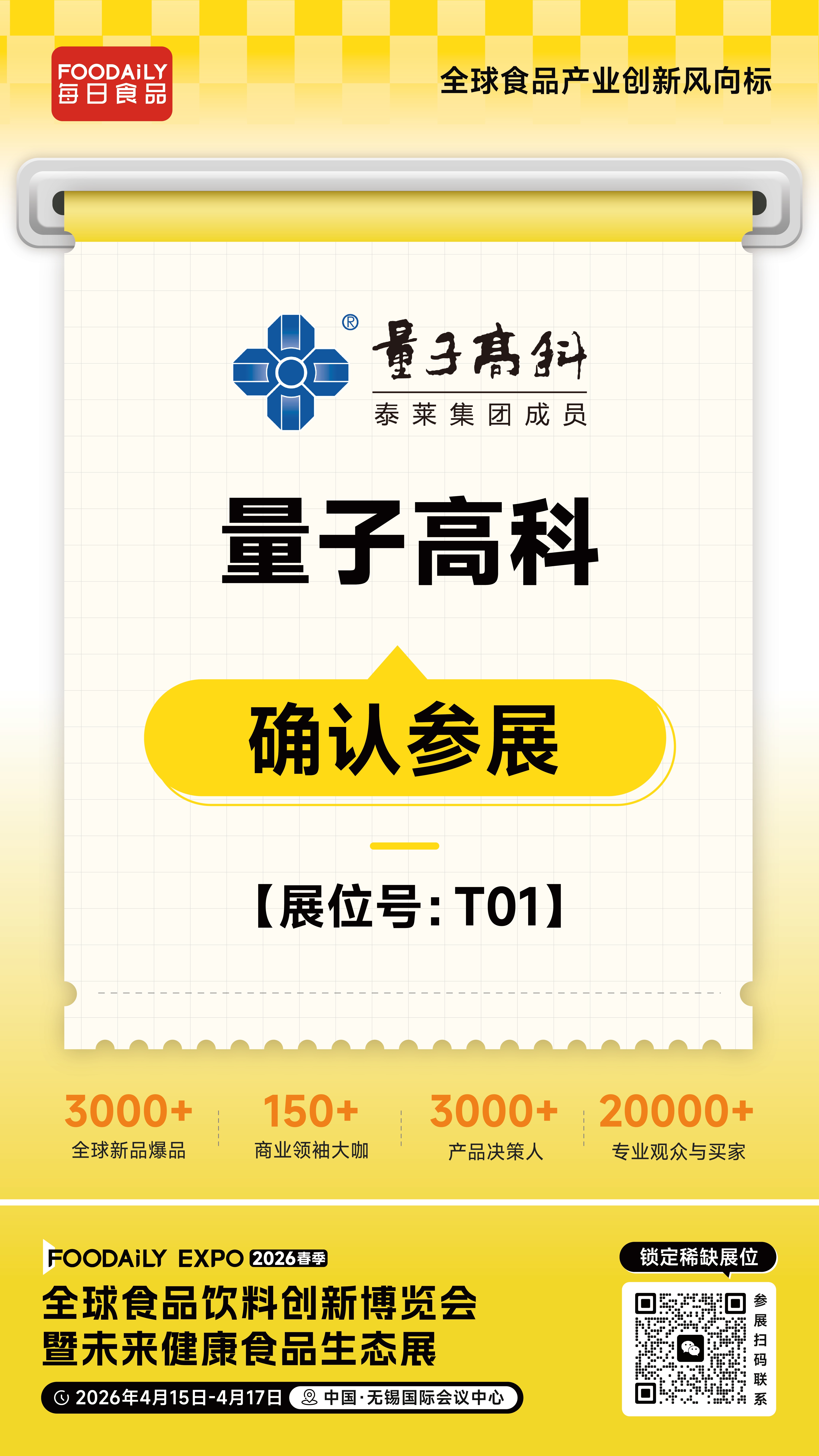 在众多参展力量中,展会迎来一则重要动态——全球膳食纤维解决方案标杆企业【量子高科】已正式确认参展!作为专注健康食品饮料配料解决方案的领军企业,量子高科的加入将为2026 Foodaily创新博览会注入更多微生态营养创新活力,与行业同仁共探微生态营养及膳食纤维创新发展之路,助力食品饮料产业创新升级。