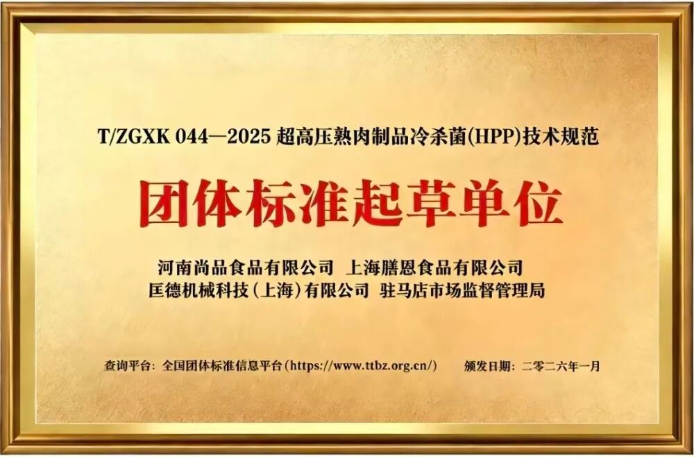 今年1月29日,由河南尚品牵头并联合产业链相关单位共同起草了《超高压熟肉制品冷杀菌(HPP)技术规范》团标正式实施,该标准是对我国熟肉制品加工领域,针对超高压冷杀菌技术的专项技术规范,为相关领域提供了明确技术指引与工艺准则。