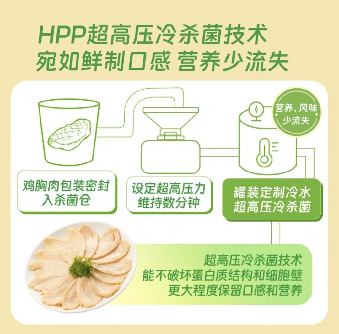 构筑更强产业壁垒,价值迭代。目前,中国在HPP装备与工艺上的标准正在不断突破,成为企业构建高端化、差异化竞争的有力抓手。通过生产热卖产品(如健身即食鸡胸肉、高端低温火腿),形成品牌高溢价,叮咚买菜HPP肉制品上市首周销量就达到同类新品的5倍,说明了,市场正用真金白银为技术升级投票!