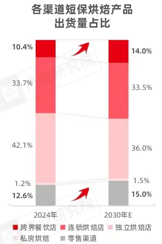 艾媒咨询在2024年进行的一项消费调查中发现:37.7%的消费者会选择线下商超购买烘焙食品。商超与烘焙专卖店、电商平台已形成“三足鼎立”之势[1]。而从出货量上看,零售端烘焙占比将从2024年的12.6%上升至2030年的15%[2]。