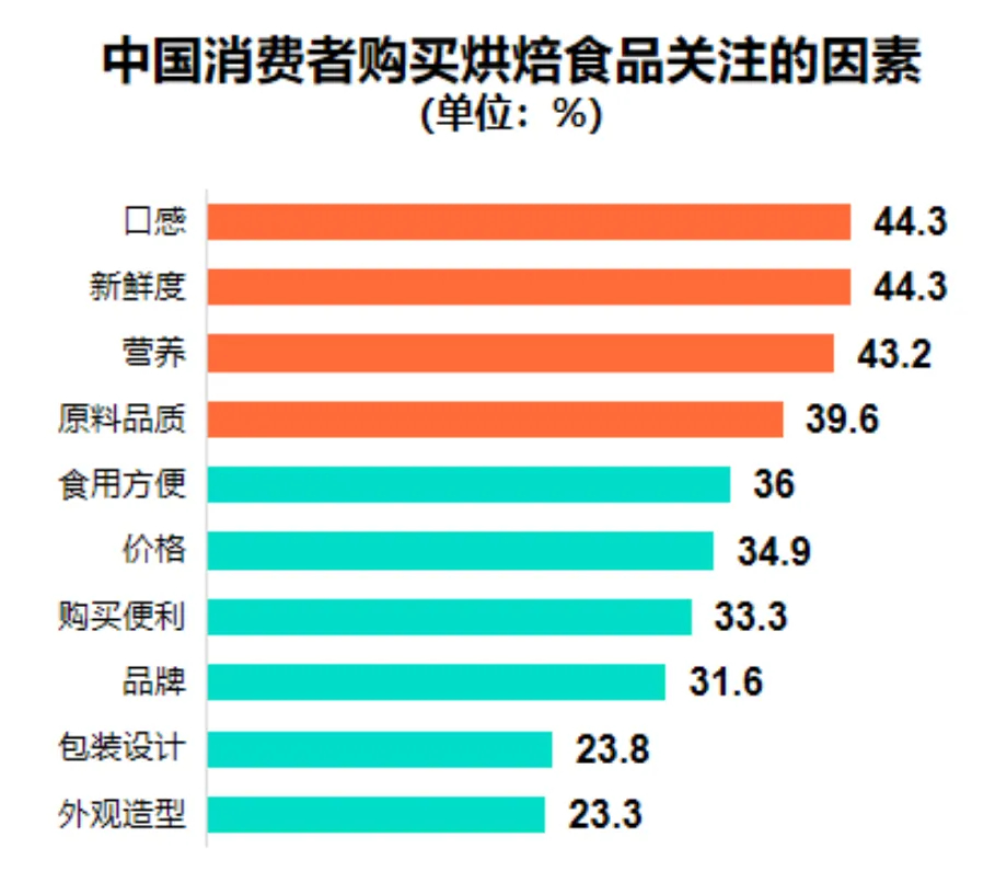 调查显示,“新鲜度”、“营养”和“原料品质”分列消费者购买烘焙食品关注因素的第2、3、4位[5]。其中,对于新鲜度的关注比例已经与排在首位的“口感”不相上下。