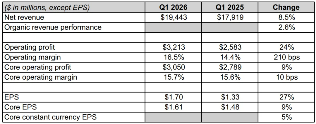 公司同时重申2026财年全年指引,预计有机收入将增长2%至4%,并计划向股东返还约89亿美元现金。