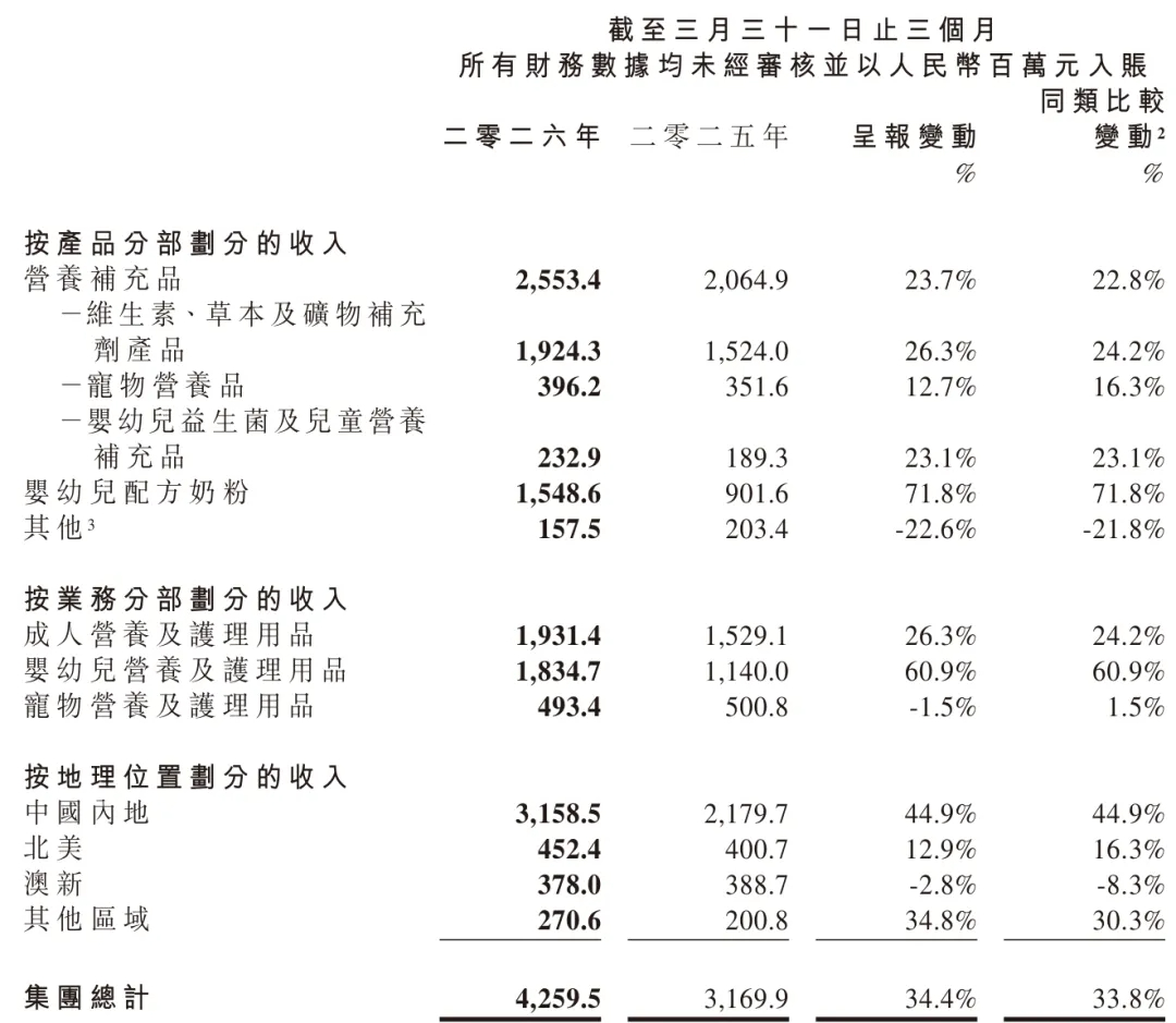 分业务看,婴幼儿营养与护理业务(BNC)实现营收18.35亿元,同比增长60.9%。其中,合生元2026年前两个月在超高端婴幼儿配方奶粉类别中的份额再创新高,达到22.1%;婴幼儿益生菌及儿童营养补充品销售额同比增长20.4%,得益于母婴专卖店及电商渠道的深化以及创新产品组合的持续拓展。成人营养及护理用品(ANC)营收达19.31亿元,同比增长24.2%。其中,Swisse斯维诗中国市场实现销售额同比增长33.5%,主要源于对新兴高增渠道的持续加速渗透。