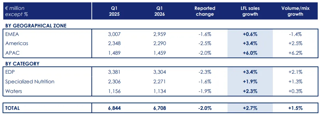 4月22日,达能发布2026年一季报,这是公司架构调整后的首份财报。报告显示,公司2026年第一季度销售额为67.08亿欧元(折合人民币约537.87亿元),同比增长2.7%,销量/组合与价格均拉动了增长。