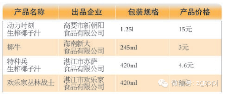 其中,湛江市苏萨食品有限公司首推迷彩图案的“特种兵”系列包装,引发了行业大量跟风。在2014 年春交会上都可看到,生产“生榨椰汁”的企业在广东一带比较多,新涌现出来的品牌有“特穿火线”、“家乡果园”、“动力时刻”、“挑战极限”等等,同质化的产品品牌多达十多个。