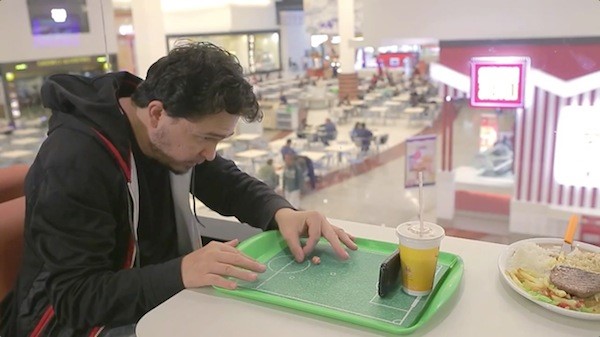 有 90% 的人会在餐厅等位或用餐间隙玩耍手机,巴西连锁快餐品牌 Giraffas 对前来用餐的消费者开展行为调研后得出这一数据,并由此开发了一项结合手机与 2014 巴西世界杯主题的足球餐盘互动项目。它包含一张设计成足球场的餐盘纸和能撕下捏成小球的侧边纸条,消费者在下载一个免费的配套 app 后,将手机摆放在餐盘一边,前置摄像头将捕捉纸球运动轨迹,从而决定是否进球得分,即刻就可开展点球大战。
