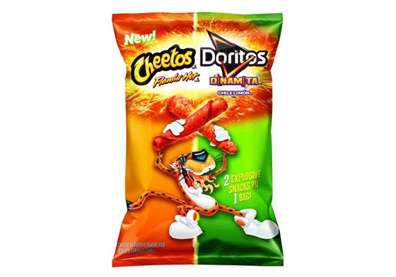 德克萨斯州普莱诺的百事公司的奇多和多力多滋玉米片正在组合成一个新产品——奇多Flamin热奶酪零食和多力多滋爆炸智利玉米卷。新的混合产品结合了两种产品深受喜爱的辛辣味和酥脆性,每一口都美味无穷。菲多利食品市场部副总裁Ram Krishnan说,“我们发现喜爱这两种产品中的一个的消费者也会喜爱另外一个,所以我们将两种辛辣酥脆的产品组合在一起,使消费者更容易享用两者。”新产品全国范围有售,建议零售价为8盎司包装3.49美元、3.25盎司包装1.49美元。