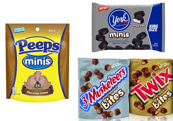 随着好时、玛氏和其他主要公司为其流行产品增加了一口大小的版本,缩小版的甜食正在日益增多。好时利用其York Minis的一口大小的胡椒薄荷牛肉饼扩展了其勉强维持的平台,而玛氏则利用Twix 、Three Musketeers和 Milky Way Simply Caramel扩展了其Bites系列。Ghiradelli同样在其牛奶巧克力焦糖、黑巧克力、以及牛奶巧克力海盐和杏仁品种中推出了小块迷你系列。不凡帝范梅勒也推出了Airheads Bites and Mini Mentos。 Mrs. Fields最近在其双倍巧克力软糖,花生酱脆片和巧克力薄片风味的曲奇中增加了一口大小的Nibblers系列。Just Born新出的产品是Peeps Minis,小鸡形状的一口大小的棉花糖糖果,有三种口味:巧克力、草莓和酸西瓜。与特许经营的季节性商品不同,迷你产品整年都可销售。