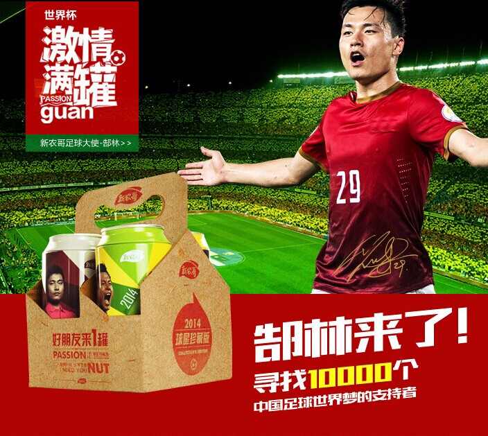第二步,打造限量版包装。这一步也是此次活动的重点。新农哥在世界杯期间推出了分享装,独特的罐装设计非常吸引人,其中包括坚果4罐手提式套餐340g 。分别为,芝麻碧根果仁70g\紫皮花生95g\开心果80g\原味腰果95g\ 共4罐,每罐罐体都有郜林亲笔签名,共推出10000罐,实行限量发售。