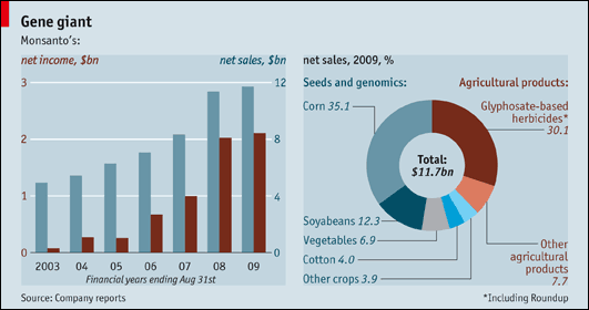 今天,孟山都117亿美元的年销售额中,大部分都来自不断增加的转基因种子品种以及基因性状专利的授权。事实上也不知是福是祸,孟山都最知名的手段就是把生物技术应用于种子的生产中,从而让生物身上这个性状那个性状的一连串专利权都归它所有,美国最高法院1980年的一项判决让这种行径获得了法律保护。七月,孟山都又往它的转基因种子库里添加了一个主要品牌,“Genuity”,公司的发言人说这个名字是想要让人感到,这东西“实在(genuine)”、“可靠(authentic)”、“原创(original)”。它的出现代表了“这个创新产品家族将能让农民重温他们的丰收,甚至会获得更大的丰收。”