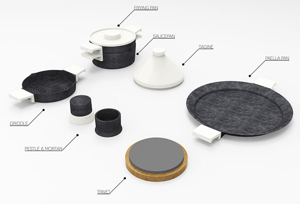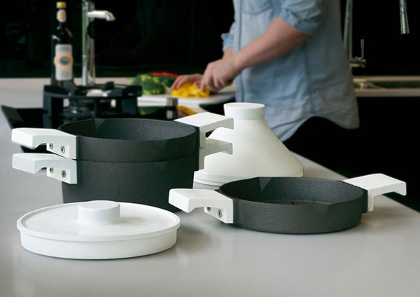 设计师 Joshua Court 近日带来一组厨具设计,包括了平底锅、炖锅、炒锅、扒炉、炉架等。黑色铁铸的锅具可以相互重叠起来,而白色陶瓷材质的把手也经过了防滑处理,两者经典的黑白搭配让厨房显得时尚、大气。