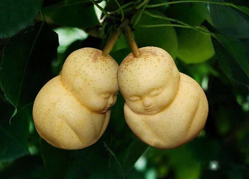 fruitmold公司生产了一款塑料制品,在果实的生长阶段,果农们用它把果实罩住,即可让梨树结出娃娃形状的梨子。这些娃娃们有着小巧的鼻子和嘴巴,眼镜安静地闭合着,双手优雅地交叉在身前,看起来非常逼真。