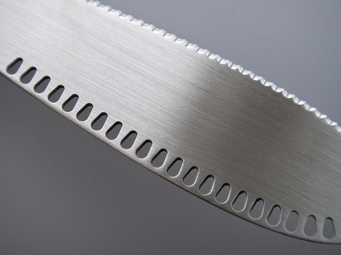 ——一把整合了刨丝器的黄油刀。它的一边是锯齿形小刀,方便切割黄油,另一边则排列了一串小孔,且孔隙的大小、形状、角度都经过多次设计试验,使它能轻松将黄油刮下,且在涂抹时不会黏附在刀口。视频: