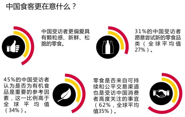 中国消费者也毫不例外,与全球平均值相比,中国消费者对零食成分的来源更加关注,更看重它们是否是来源于可持续或公平交易的渠道(62% vs. 全球平均35%),或是否是有机食品(45% vs. 全球平均34%)。