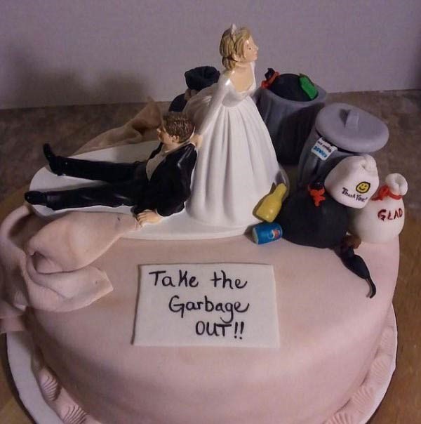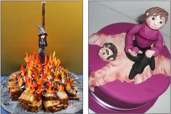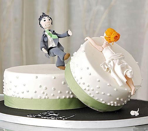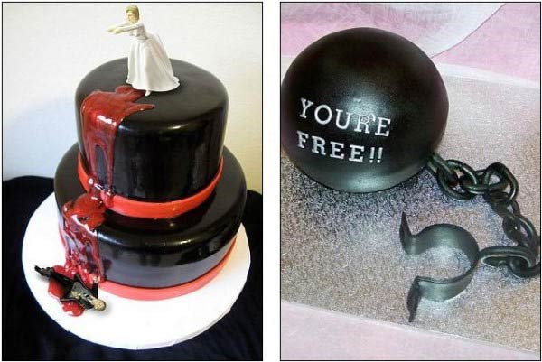 切蛋糕通常象征着婚姻的开始。但也有越来越多的夫妇说“我不愿意”时,用蛋糕来庆祝一段不美满婚姻的结束。现在设计一个古怪的离婚蛋糕可是跟结婚蛋糕一样昂贵了,一些设计师被要求重新设计一个单身的男人女人,以此庆祝他们重回自由身,这些古怪的设计包括新娘被施以火刑,新郎被活剥皮,还有将结婚戒指埋在奢华的棺材里。