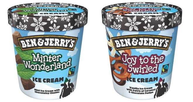 Ben & Jerry's公司推出了两款冬季假日风味冰淇淋:薄荷仙境冰淇淋(Minter Wonderland)和欢乐奇旋冰淇淋(Joy to the Swirled)。