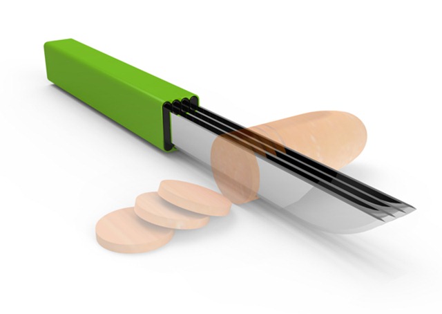还记得小学的时候老师罚写字,一罚就是50遍,你是不是一手抓3只笔再写写画画。自塞尔维亚的在校女生 sneana jeremi 估计就被老师惩罚过,所以她设计的刀具Zon就是巧妙的利用这一点哈,一个刀鞘中包含4把小刀,即可以像普通菜刀那样单独使用,也可以一起使用,切菜速度轻轻松松提升三四倍。