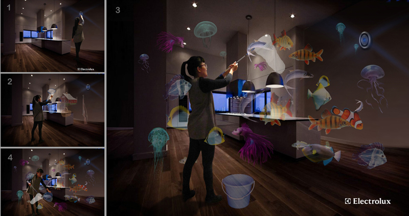 在全球颇具影响力的伊莱克斯设计实验室(Electrolux DESIGN LAB)一直是实验室关注的设计大赛之一,近日,其 2014 年度总决赛在巴黎落幕,中国学生王盼的设计作品“情景式购物系统”夺得冠军。她使用全息影像的方式,让消费者可以在虚拟的自然场景中钓鱼、狩猎、采摘果实;采集到的食材信息会传送到当地的市场或杂货铺,再通过物流送到每位消费者的厨房、餐桌上。