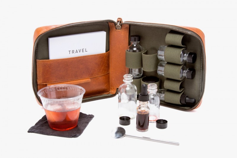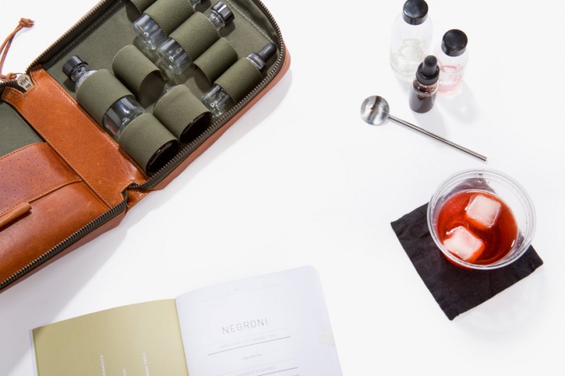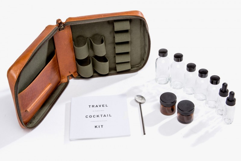 洛杉矶家具设计师 Stephen Kenn 联手 Gin & Luck 带来的这组旅行装。设计师选用黄棕色皮革来制成这款调酒工具包,内层搭配橄榄绿色的帆布,并用 9 条松紧带固定住大大小小的玻璃瓶罐;另一侧放置了搅拌勺,夹层里则备有一本简单的调酒指南,里面介绍了 15 种不同鸡尾酒的配方。如果旅途漫长枯燥,这个迷你酒吧会增添很多乐趣吧。