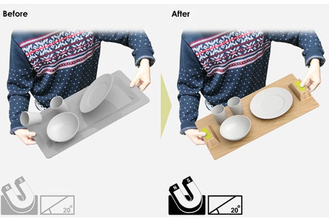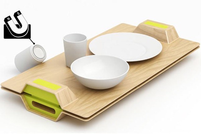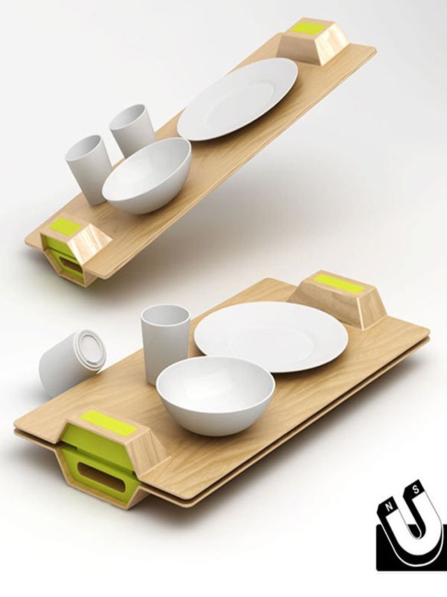 在食堂打餐的时候最怕就是拥挤人群中你一个不小心,碗啊盘子杯子的摔倒,醉不醉的不说,光是汤汤汁汁的溅一身也真是够啦。有能力的公司或者贵族学校就应该提供这样的餐具餐盘,内置强力磁铁,需要的时候双手一按,盘子碗碟就会乖乖的被吸附住,不需要的时候一按又可以轻松解除,避免小尴尬小插曲。