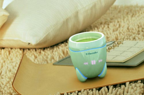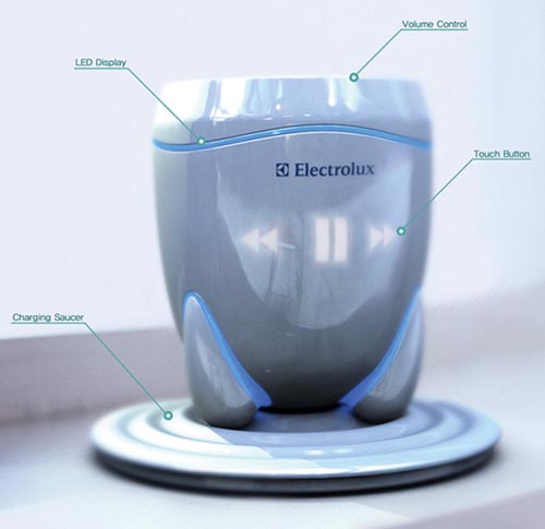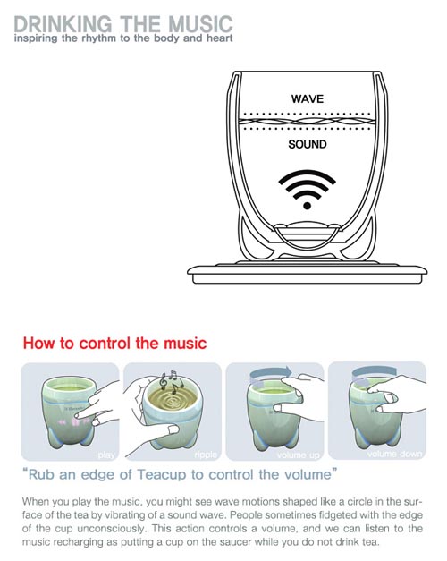 这是由设计师Kukil Han带来的一款伊莱克斯概念产品:音乐茶杯。简而言之,就是一个集合了音乐播放功能的茶杯。茶杯上设有触控按钮,通过触摸操作可以选择上下曲面,以及暂停。更为有趣的是,调节音量的触摸按钮在杯口,喝茶时用嘴即可控制。音乐播放时,声波震动带来一圈圈水波,带来视觉上的享受。喝完茶后,将其放在茶托上完成充电。
