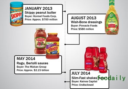 例如,联合利华在这一年内出售了旗下斯丽法(Slim-Fast)、瑞谷(Ragu)和百多利(Bertolli)品牌,专注于更有利可图的涂抹酱和冰淇淋业务方面。联合利华表示,资产剥离意味着公司在北美地区重组的结束,从而加强对食品业务的关注。2013年,该公司出售了其四季宝(Skippy)花生酱和如愿骨(Wish-Bone)沙拉酱品牌。