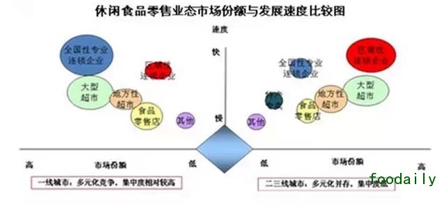 而二三线城市则表现为:多元化并存,集中度较低。区域性食品零售连锁企业与大型超市占据较大市场份额,发展速度相对较快。休闲食品的零售竞争主要集中在国产食品方面,进口食品在二三线城市的竞争力明显弱小,难以与国产休闲食品相抗衡。可以预见,未来几年,二三线城市将会成为休闲食品零售的一个新增长点。