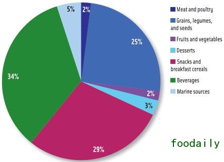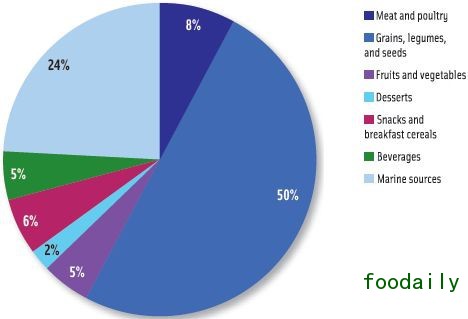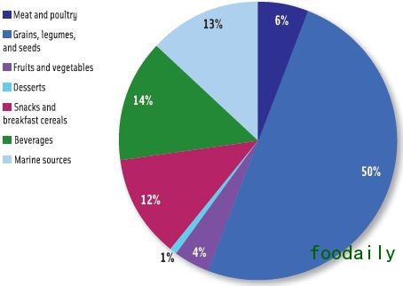 图1.食物群对美国一般人群无机砷暴露的作用。牛奶、奶酪以及调味品、糖和甜味剂等食物群均未造成砷暴露。