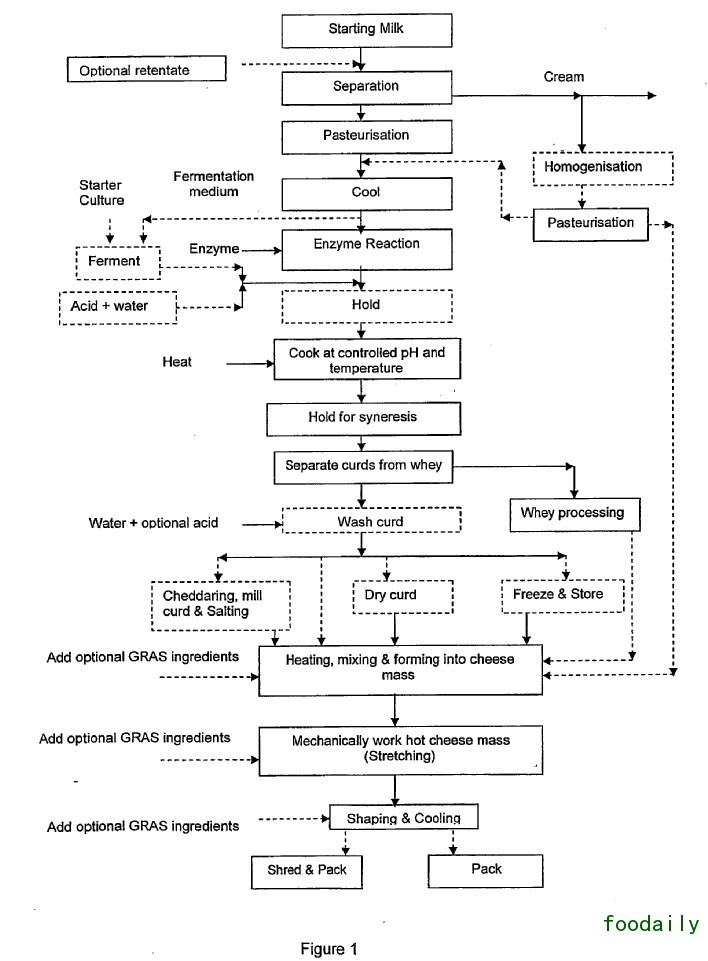 “任何一个奶酪制作方法,如果可以减少反复不定的变化,减少传统奶酪的一些生产步骤,并且可以保持最终产品功能性质的灵活性,这就是奶酪加工业所需要的方法,”专利申请上写到。