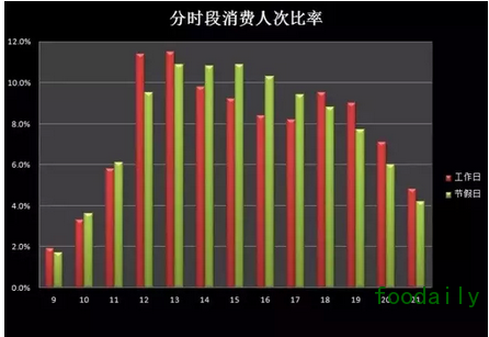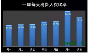 奶茶作为休闲食品,自然周末最高,周末过后进入消费疲软期,周一到周三都比较平淡,但平衡,直到周四开始上涨,这张图中也可以看出,周末两天中周六外出的人比周日要高两成。