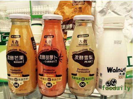 产品:大者发酵果汁,是国家863计划重大科研成果,采用益生菌发酵技术,NFC非浓缩还原技术保持了产品的原汁原味;产品规格为310ml,零售价为6.8元/瓶。