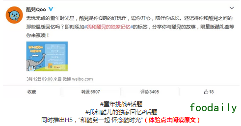 为了最大范围的让回归的消息散播开来,酷儿选择微博作为传播的主战场,发起#我和酷兒的独家记忆#、#童年挑战#话题在勾起儿时记忆的同时,也告诉大家“酷儿回来了”。