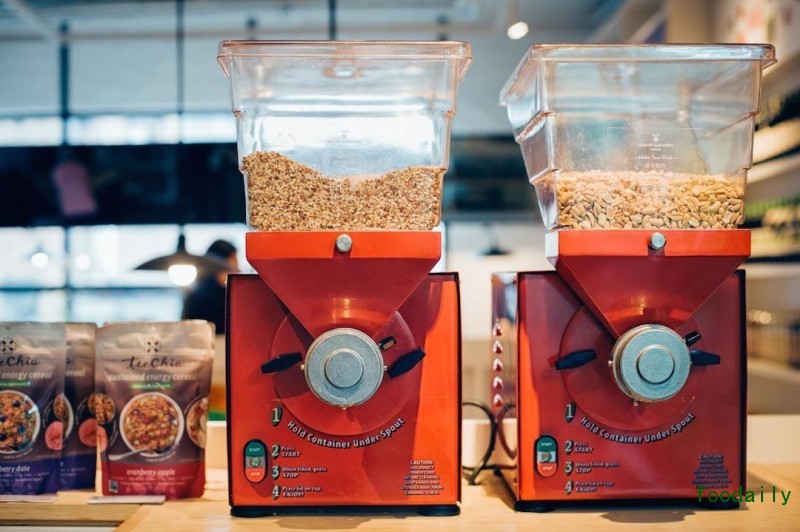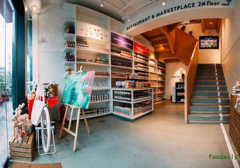 Hunter & Gatherer 的陈列并不显得刻意。这里用一种整理癖一般的风格展示将近 300 个 SKU(零售术语,货品量的基本单位),75% 的品牌是进口的,其余是姐弟俩从本地发掘的,比如来自新疆的奶制品。物品的有序陈列几乎构成了所有的墙面装饰。然后你还可以发现花生酱机这种国内不常见的东西,你可以拿起旁边的空玻璃罐,然后自己制作一罐花生酱──Harn 的解释是,这样可以消除顾客和店铺之间的距离感,获得一些探究的乐趣。