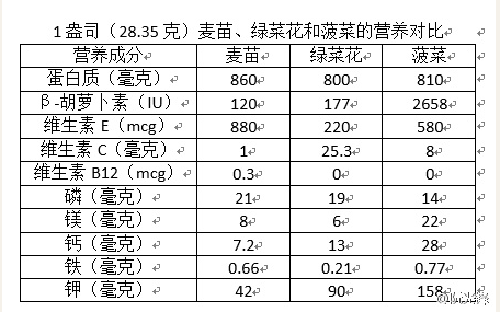 1盎司(28.35克)麦苗、绿菜花和菠菜的营养对比