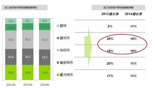 地级市及以上的消费者是进口食品的主要购买者,县级市和地级市在前年和去年的增幅大大高于省会城市和重点城市,进口食品在抓大城市商机时,下线城市的购买力也不可忽视。