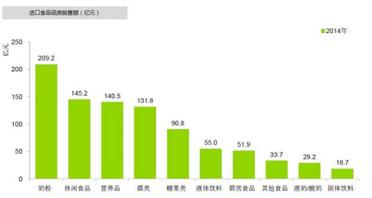 在2014年的进口食品销售额中,奶粉比重最高,达到209.2亿元,其次是休闲食品(145.2亿元)和营养品(140.5亿元)。