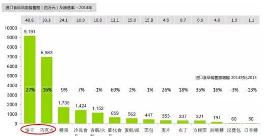 在休闲食品和糖果中,进口饼干和巧克力最受中国消费者欢迎。