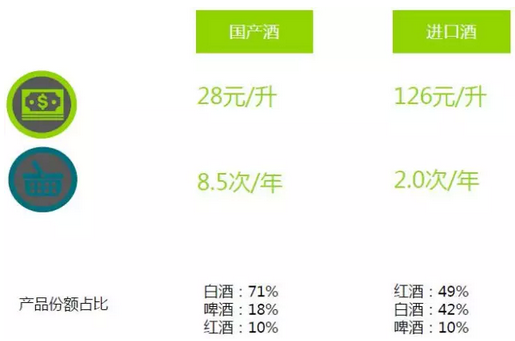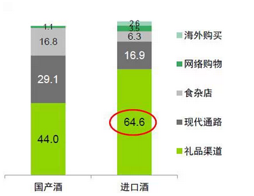 在快速消费品渠道,国产酒与进口酒消费量接近9:1。