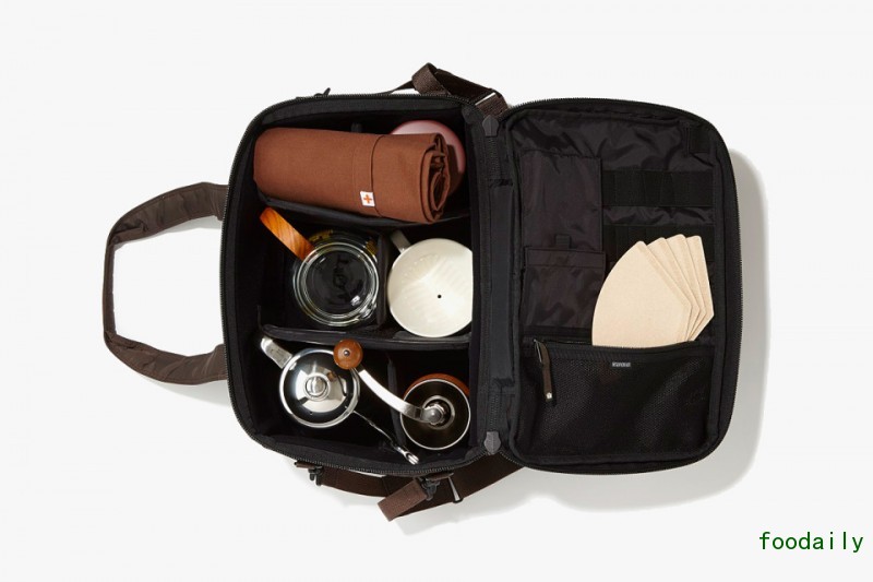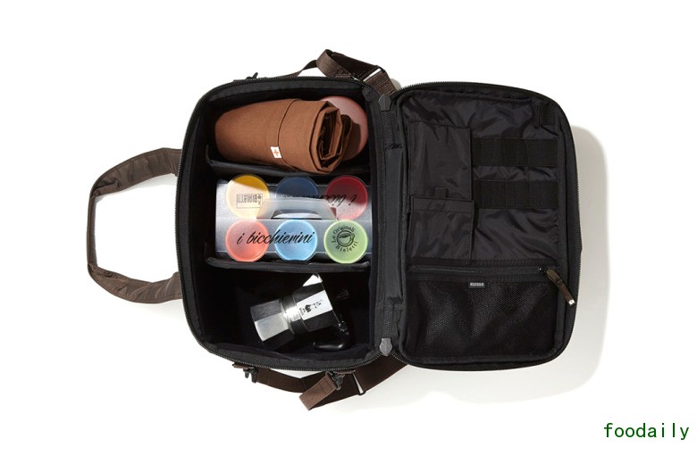 就像是摄影师珍藏他们心爱的镜头那样,HEAD PORTER 设计的咖啡包袋里也用细致的隔断,划分出不同的器具空间。TORIBA COFFEE 也准备了一整套咖啡用具,如手冲咖啡壶、研磨器、滤纸,或者是喝 ESPRESSO 的套杯,另外还有给专业咖啡师准备的温度计、咖啡勺和电子秤等,应有尽有,务必让每位咖啡爱好者都各有所获。