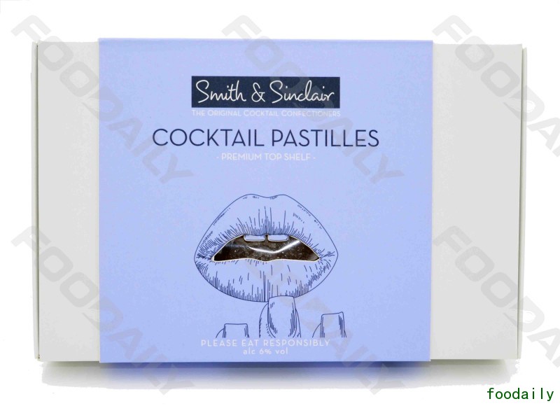 日本糖果仍然偏爱传统的水果、焦糖、巧克力等风味,而欧洲人则大胆地将钟爱的鸡尾酒元素融入到糖果中。英国Smith & Sinclair公司推出的一款软糖(8#)就是由三种烈酒——朗姆酒、杜松子酒和威士忌——调制成六种鸡尾酒口味(杜松子滋补酒口味、混合浆果代基里酒口味和威士忌酸酒口味等),给产品注入了全新的生命力。日本的Kabaya Foods公司则在一款偏硬质构的糖果(4#)中糅合了可乐、苏打这些饮料流行风味