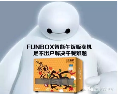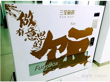 简单说,这就是一款智能。只不过,跟传统的投币、扫码支付售卖机不同,FUNBOX是将“APP+智能售卖机+中央厨房”链接起来,形成一个完整的餐饮O2O 闭环。即顾客可以提前用手机通过三全鲜食的APP在线点单、然后在售卖机取餐,而所有的盒餐均由三全中央厨房统一生产、冷链物流配给、补货。