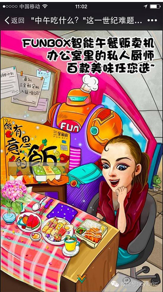 这个内容,其实除了好吃,还有放心、好玩,一切围绕产品和体验来做文章。登录鲜食的APP、微信公号可以看到,时尚潮酷的FUNBOX外观、个性的菜名、贴合白领日常生活的场景游戏、微电影、微漫画等……将本是枯燥的午餐时段变得生动有趣起来,这也正是三全鲜食赋予自动售卖机人格化、弥补硬件短板的核心竞争力之一。
