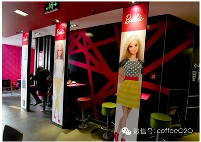 麦当劳在北京、广州、青岛、重庆开了多家芭比主题餐厅。店内各个角度都设有高挑靓丽的芭比人形展板,椅背、墙面也被加上芭比元素,还有放满整个橱窗的迷你芭比娃娃系列,甚至连店员的服装也是粉色。