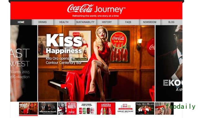 这个改版后的主页名为“可口可乐 Journey”。它的整个页面栏目感清晰,就像一本电子杂志。除了主页项,它还有“饮料”、“健康”、“企业社会责任”等栏目。